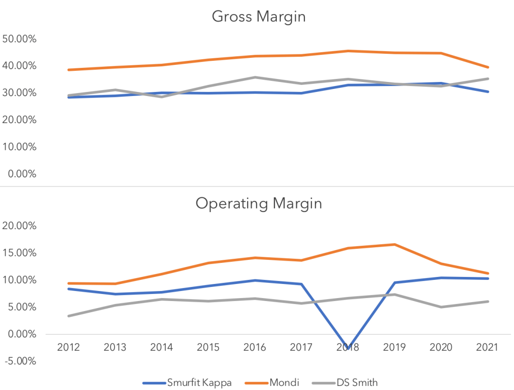 If now jump to the bottom line then Mondi takes too spot again. it’s five year average return on equity is 17.9% which has Smurfit and DS Smith—with their returns of 8.5% and 9.0% respectively—beaten comfortably.