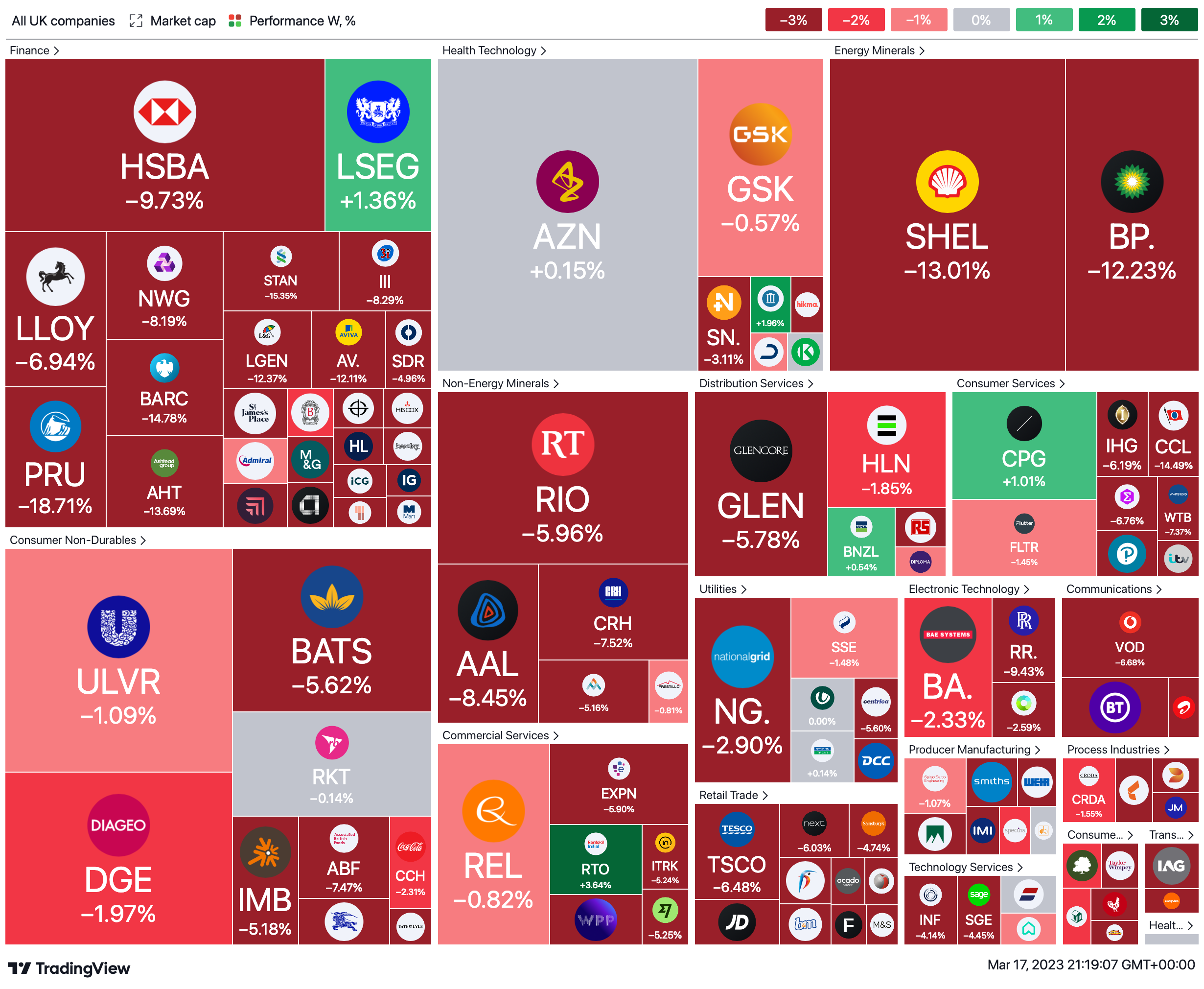 The fall out from the collapse of Silicon Valley Bank spread right across the global financial system. It was not just bank stocks that took a hit. In the UK not a single industry group managed to book an average gain this week. The oil price crashed and natural gas slumped. That is never good for oil and gas majors. It was the energy industry that performed the worst on average in the UK markets, followed by consumer cyclicals and basic materials.