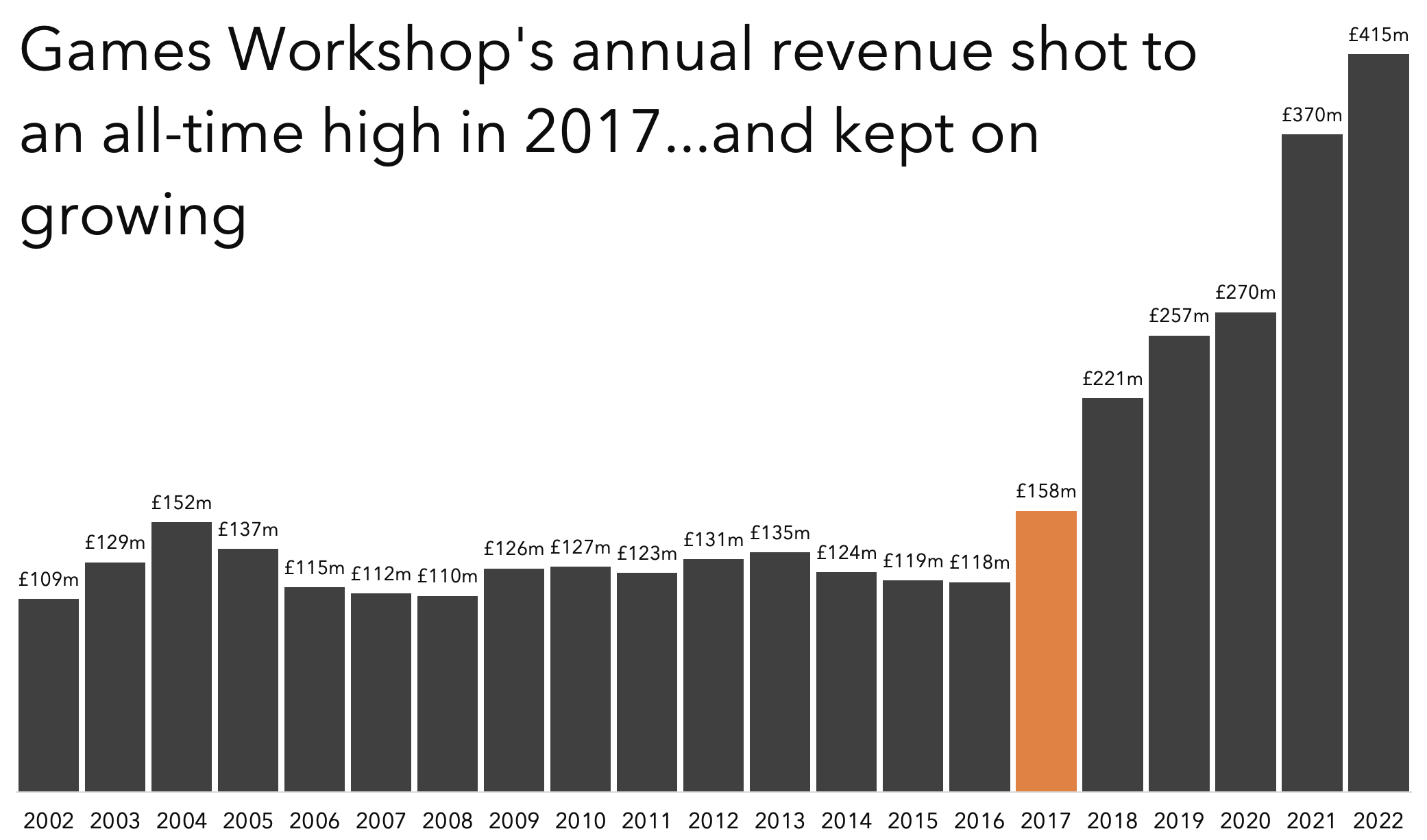 A canny investor looking watching the buzz around that show how and thinking this will make this kind of thing cool again, or at least drive interest in it up, would surely have looked at games workshop and had a change of heart if it needed changing. Miniature painting, and TTRPGs had been niche activities, very much enjoyed in small circles. But YouTube and the like enabled larger communities to be nurtured and grown. But I think Stranger Things really lit the fuse.