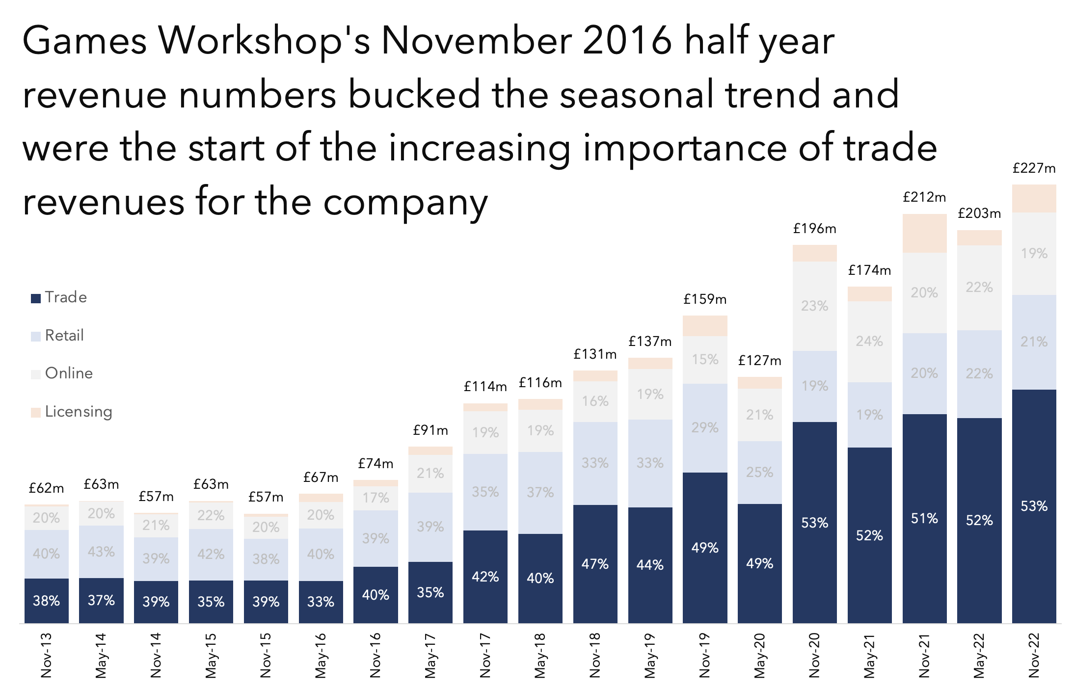 He also green-lit the rebranding of stores to “Warhammer” to match what customers called them. And his early tenure was also marked by increased efforts to market the company via social media, better recruitment and training practices, and open more trade stockist accounts. These are responsible for Games Workshops trade, or third party revenues, which are sales from non-company owned stores.