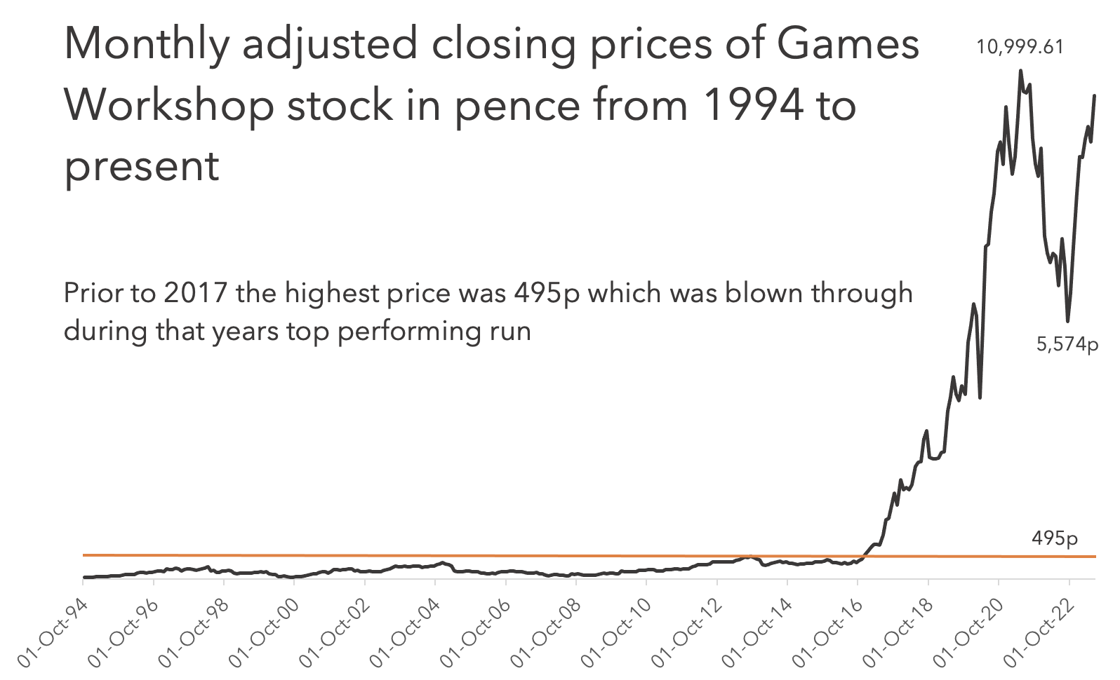 Drilling down to a weekly price chart and yes, its definitely right at the end of 2016 and going into 2017 that that old high gets broken, and then the share price keeps on going. There are a number of either annual reports, interim reports or trading updates that were released around those dates, that seem to coincide with price jumps or accelerations of the upwards trend in the Games Workshop share price.