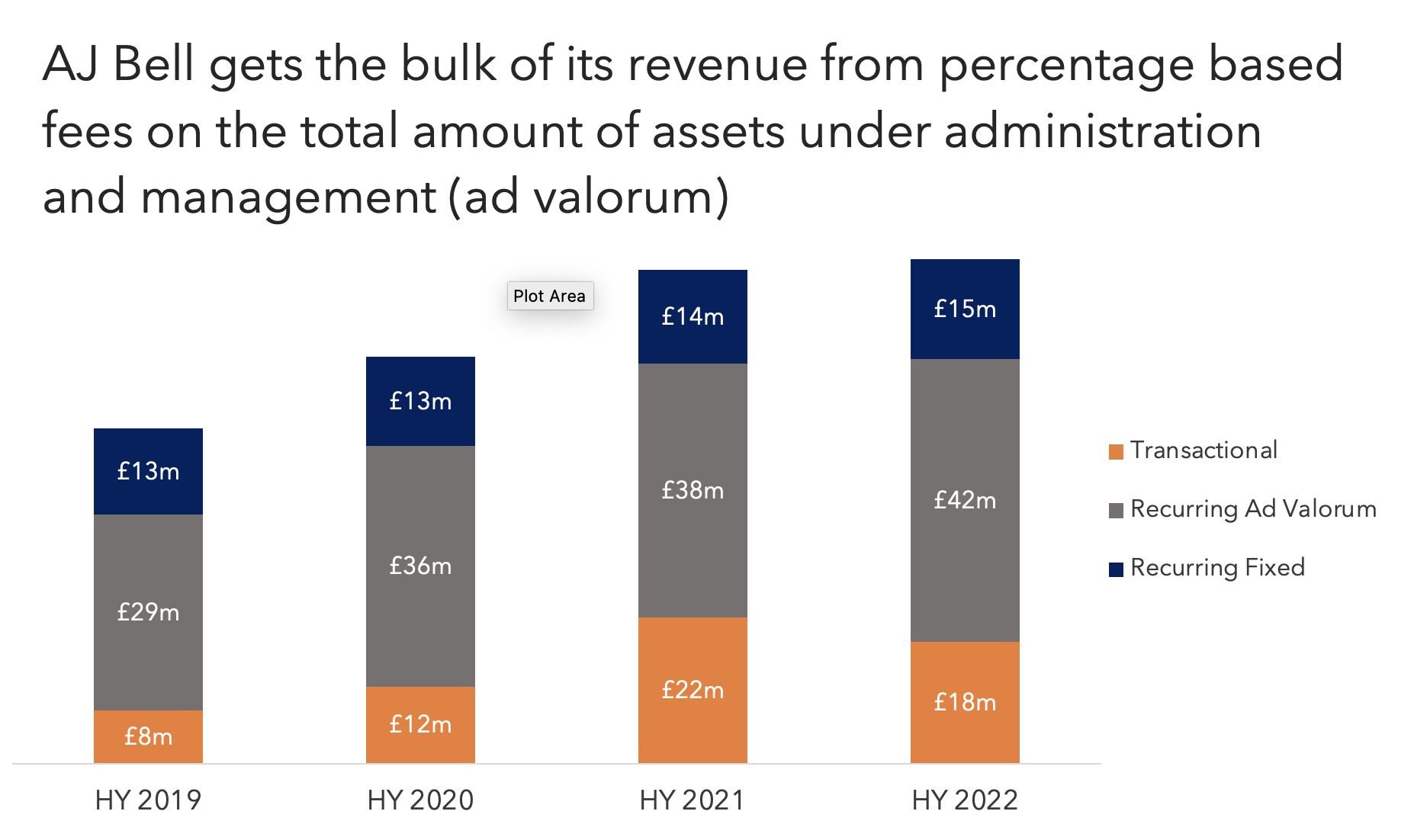 AJ Bell collects variable fees based on the value of assets held in its accounts under administration and management. These are referred to as recurring ad valorem fees. It also, collects dealing charges when customers make trades, and adds FX commissions if the trades are in foreign assets. These are termed transactional fees. There are also recurring fixed fees for things like pension administration and content and data subscription charges from AJ Bell’s media wing.