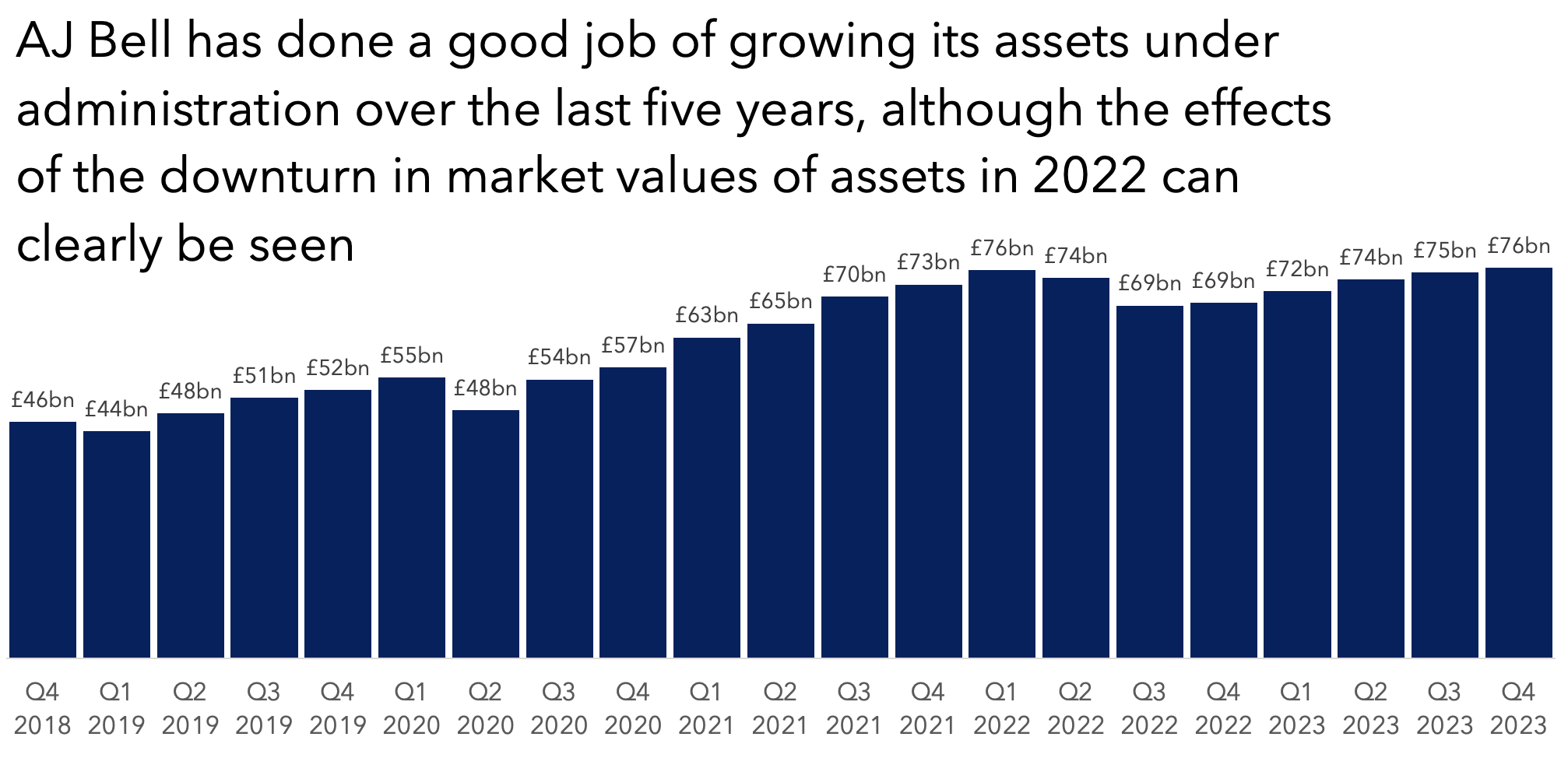 AJ Bell has grown its assets significantly over the last five years. It gets its face in front of potential customers by advertising, unsurprisingly, but also sending expert employees to do interviews, and pop up on websites taking about savings and investment, tax matters and the like. There was a blip in AUA growth in 2022 as markets values tumbled, and perhaps some customers pulled money out of accounts, but since them AUA have recovered.