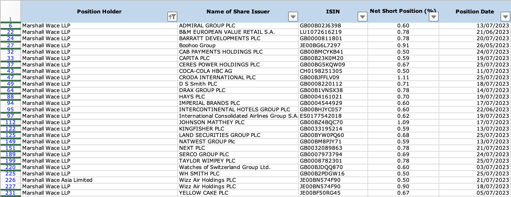 First up let’s examine the claim that Marshall Wace exited its net short position against NatWest shares. According to yesterdays FCA short sellers report it still held one, it was last modified on 13 July, 2023, but still remains current.