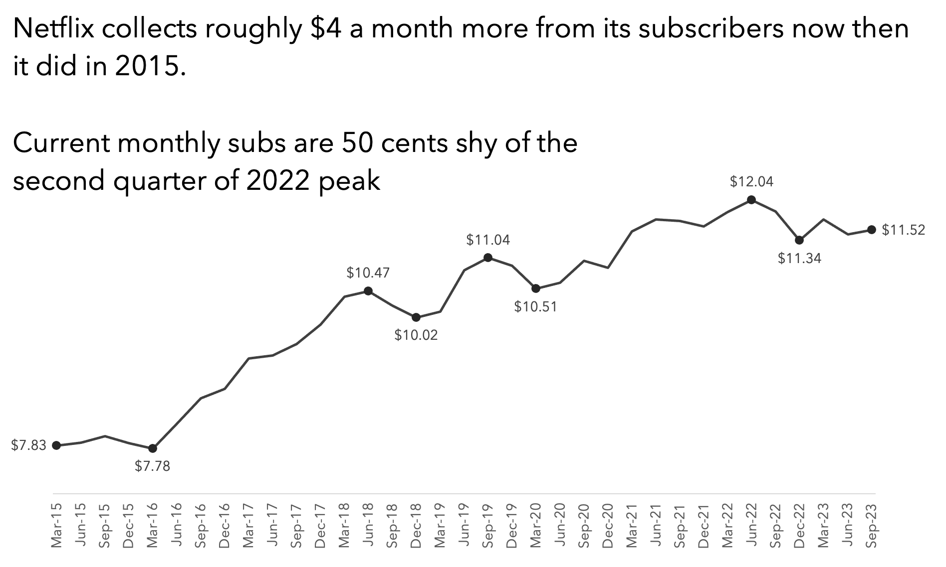 But there are always concerns. Content is king for streamers. Content is getting more expensive to make and license. Amongst other factors, the deal to end the writers’ strike could add $68m a year to Netflix’s expenses. However, the subscription pricing increases seem to have dealt with that and then some.