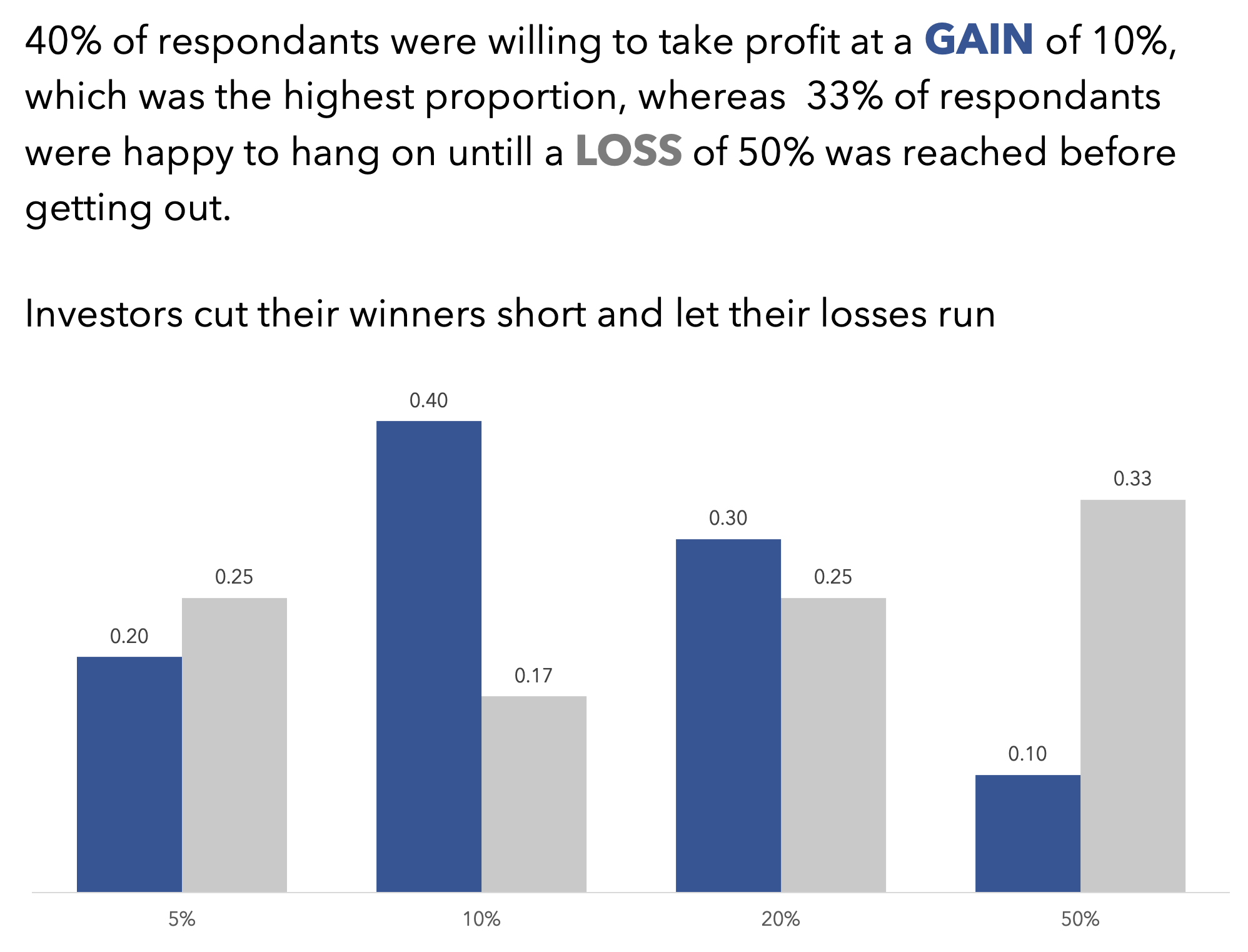 I got 20 responses to the winning long position poll and 36 for the losing long position poll. 40% of respondents would take profits after their long position had hit 10%. 33% of respondents would not cut their losing position until it hit 50%. That is fairly clear evidence of asymmetry, and a predilection to cut the flowers and water the weeds in the retail trading community.