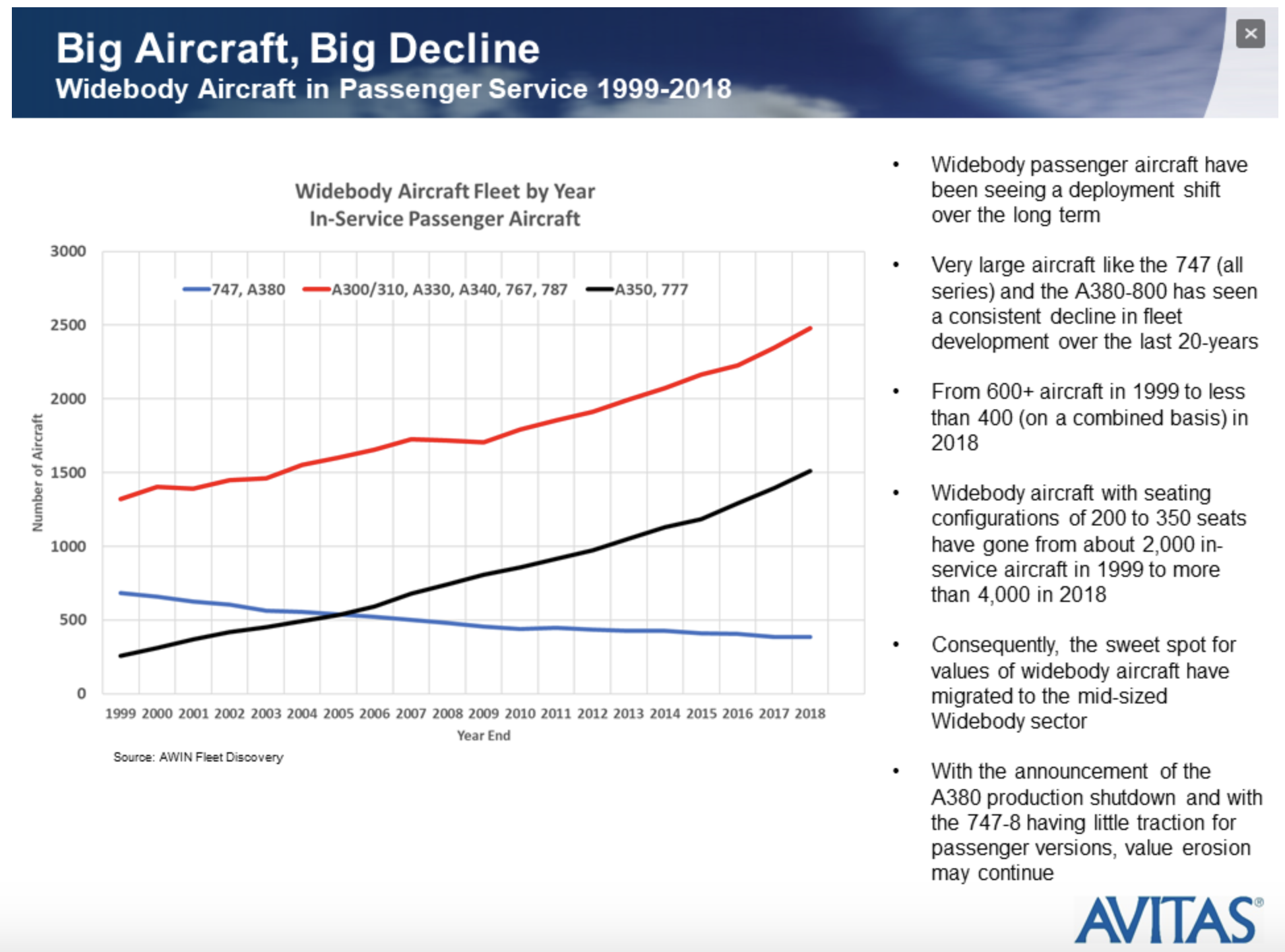 Furthermore, I find the cheer about leaning into widebody planes disturbing. That’s precisely what helped wallop Rolls-Roe during the pandemic and after. Long haul routes, served by wide body planes, were the first to fall and the slowest to recover. Rolls-Royce bills per hour flown for servicing of its engines. It needs planes in the air. And wide-body aircraft have been in decline well before COVID-19 darkened out doors. Check out this graphic from Avitas: