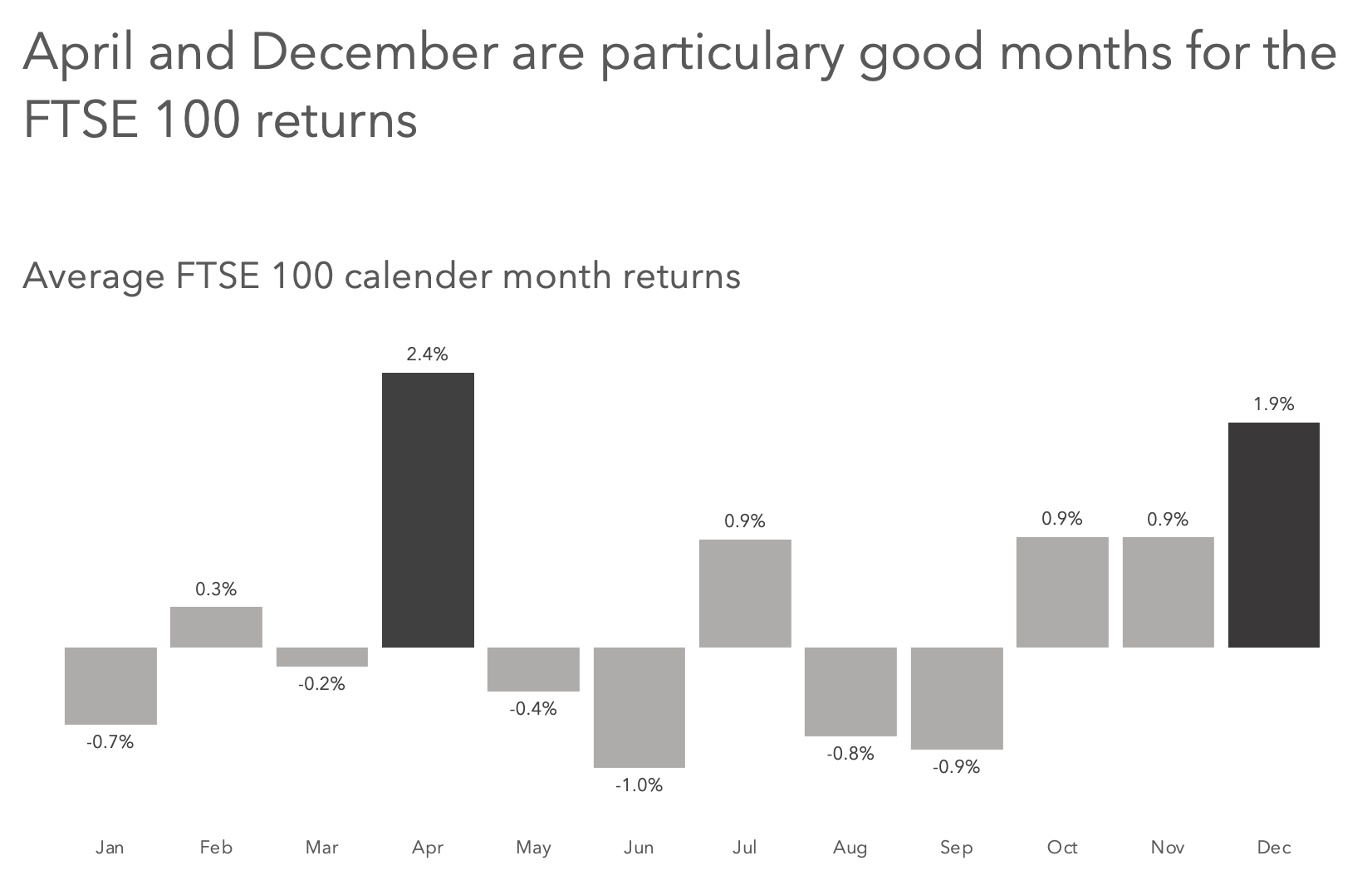 It is always wise to be wary of historical patterns holding in the future. However, looking at the averages for the FTSE 100 calendar months, it may be thought that going long in February, April, July, and October through to December, and short at all other times would be a strategy that beats the index.