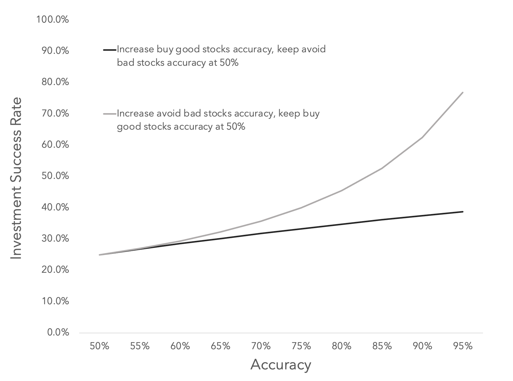 It tuns out its the latter and its not even close. If the investor takes their pick good stocks accuracy from 50% to 95% their investment success rate increases from 25% to 38.8%. Good, but increasing the avoid bad stock accuracy from 50% to 95% takes the investment success rate from 25% to 76.9%.