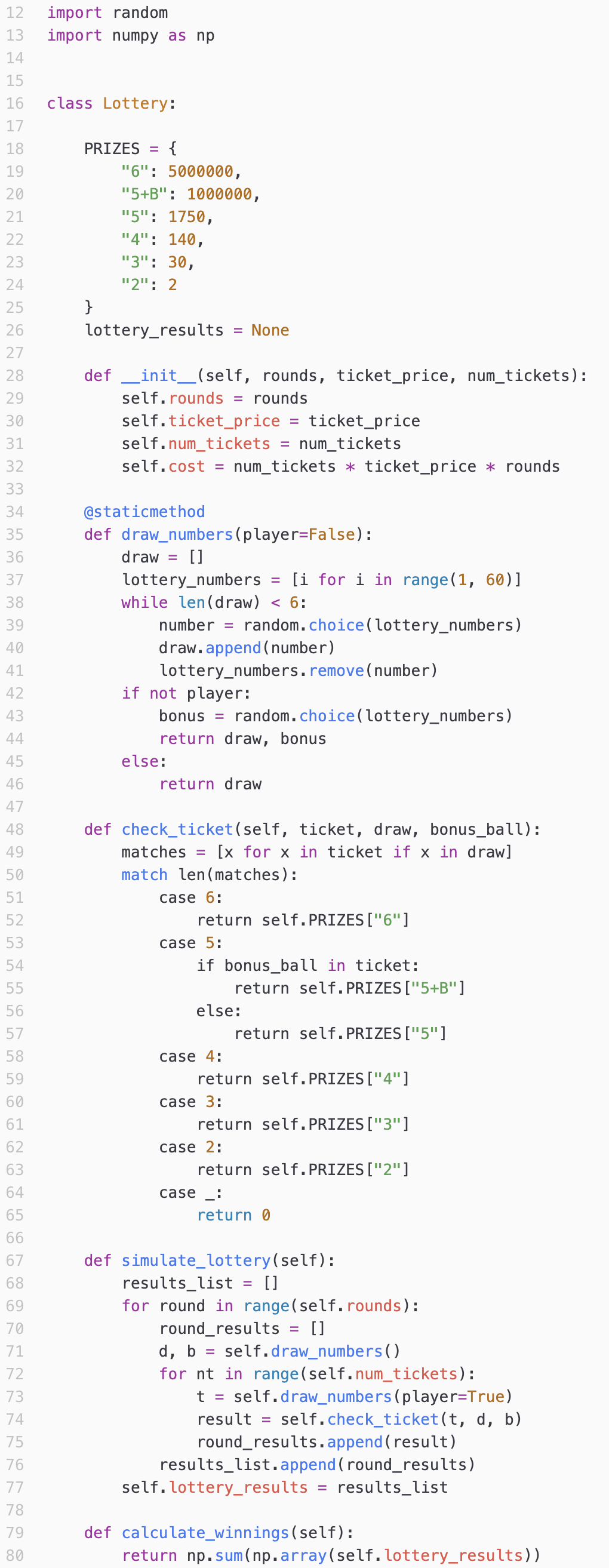 I used Python to simulate playing the lottery, by making a class called Lottery that handles setting up a random draw with a bonus ball, handling multiple lucky dip tickets and checking if there are any winners. As for prizes I took what I could find for averages from the National Lottery website. Now the £5m jackpot prize was somewhat arbitrary. I could find the maximum jackpot won, minimum jackpot won, something called an average maximum jackpot and an expected minimum, none of which were helpful, and multiple tickets can win the jackpot complicating things. So I went for £5m which is above the expected minimum jackpot of £3m (or £2m if its a midweek draw) but below the £13m stated for the average maximum jackpot.