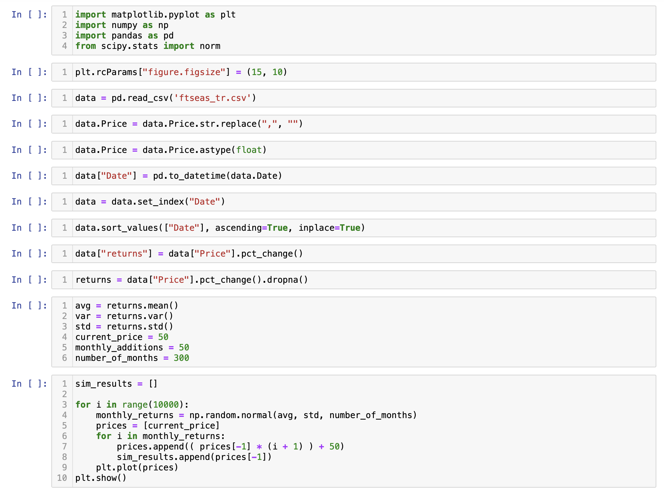 What this code does is generate 300 separate random variables representing our returns over the quarter century from a normal distribution with mean 0.51% and standard deviation 3.94%. It is assumed that returns are normally distributed. A starting value of £50 gets the first random return applied, then fifty pounds is added and the next return is applied and so on.