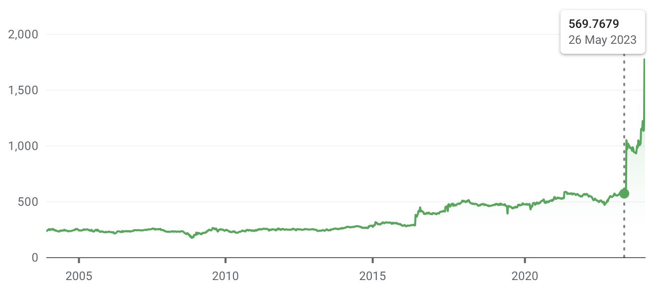 Since about 2015, the number of Nigerian Naira one British Pound will buy has been steadily climbing. That means the Naira is devaluing or weakening relative to the Pound. Around the end of May 2023 the Naira really started to collapse in value. From then until now the number of Naira one Pound will buy has increased from 570 to 1,777, which is a 109% decrease in the value of the currency of Africa’s biggest economy.