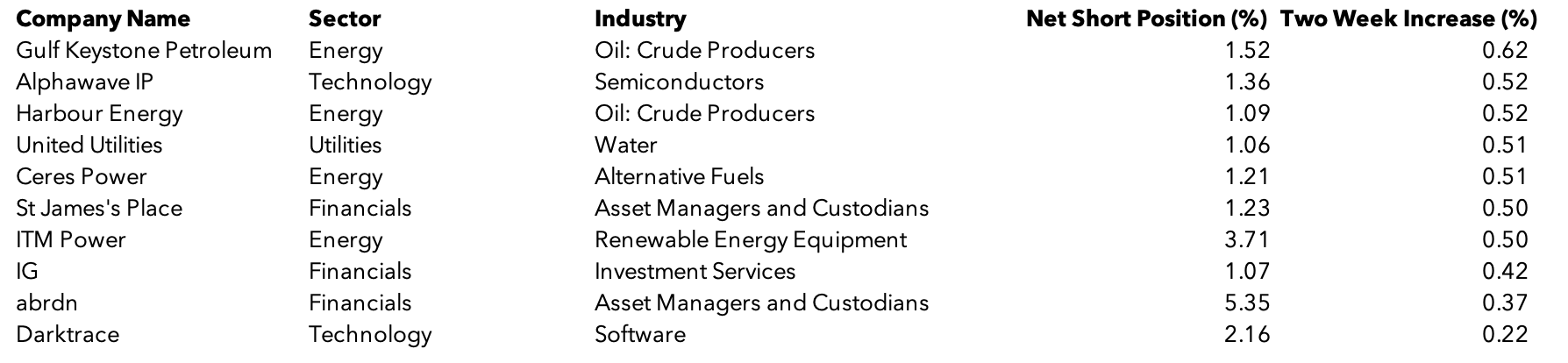 Gulf Keystone Petroleum is the stock that short sellers have been building their NSP against the most: it has increased by 0.62%. Energy and Financial sectors seem to be under attack this week, accounting for seven of the top ten. Technology companies Darktrace and Alphawave IP, plus utilities firm United Utilities compete the top ten.