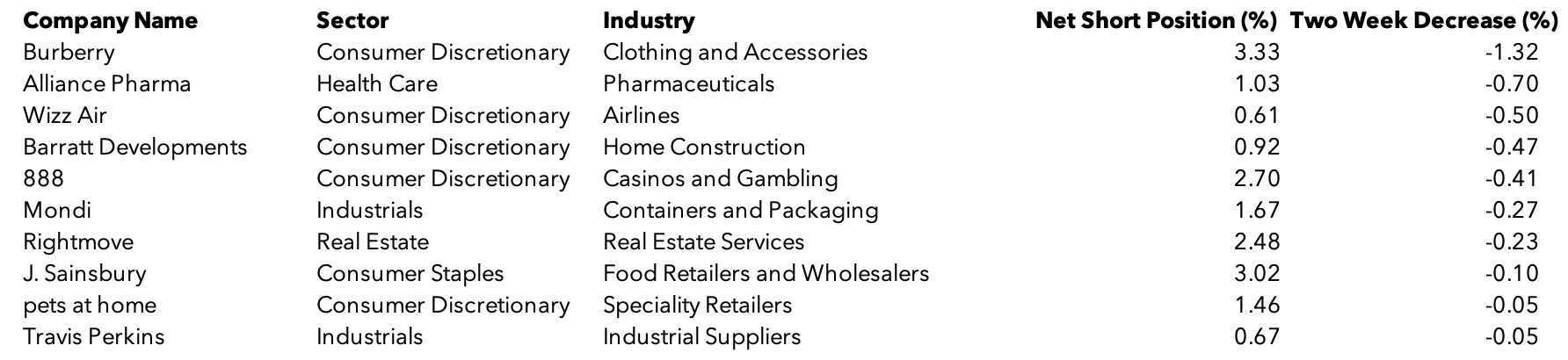 The 10 UK stocks whose net short position declined the most over the last week