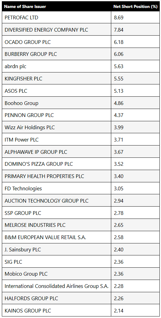 If someone is betting heavily against a UK stock I either own, or plan to own, then I’d want to know about it. Luckily, all firms with a net short position greater than or equal to 0.1% of the issued share capital against a listed UK listed company have to report that position to the the Financial Conduct Authority (FCA). The FCA publishes a daily short position update based on the notifications that it receives reporting those company’s with an aggregate net short positions in excess of 0.5% against their issued share capital along with the identity of the position holders.